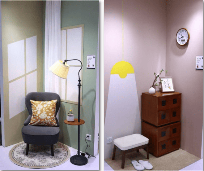 “幸福一平米”的适老化情景角由关怀入户角、纯净卫浴角、晴空阳光角、治愈休闲角四个一平米空间组成,每一个空间的墙面都采用了多乐士墙面漆,无论产品的选择还是色彩的搭配,都是专门从银发群体的角度出发,让老年居家生活温暖愉悦,富有诗意。