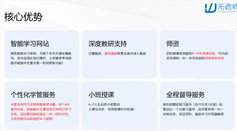 1. 新东方雅思:规模大但体验参差 新东方的品牌和分店规模不用多说,但各地师资、服务差距挺明显。我在家附近门店报过课,发现老师更侧重 “应试模板”—— 直接给 7 分作文框架、“考官必过句型”,说按这套写就能拿分。可实际考试中,题目和模板适配度很低,生搬硬套反而显得生硬。全程学完,成绩还是 5.5,和我裸考没差。如果选这里,一定要重点挑老师,不然很容易浪费时间。 2. 无老师国际雅思:全程干货亮眼,集训营且性价比高 这个机构是朋友推荐的,偶然听到她上的 “雅思集训营课”(授课老师多数是留学海归),觉得很专业。了解后发现,它家价格比其他机构高不少,我也跟着报了个集训营课(老师们每天答疑特别快捷回复)。 我的写作基础弱,首战面对写作紧张到翻车,跟着集训课程学习后,不仅学到了常规备考技巧,还 get 到了 “考官评分视角” 的加分细节 —— 比如哪些表达方式能给考官留好印象,这些 “小内幕” 特别实用。习惯了多次写作及批改反复流程,考试时紧张感减少了很多,最后写作6.5分、口语7 分,远超我的预期。